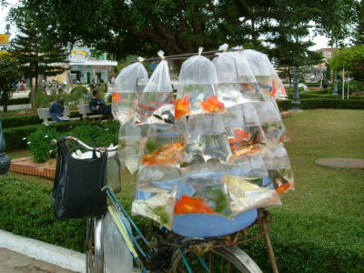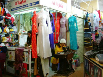 市場の2階はフードコートというか、屋台の食堂街?になっていました。 3階は衣料品、靴、食器など日用品の店などがありました。 ここはアオザイ専門店。